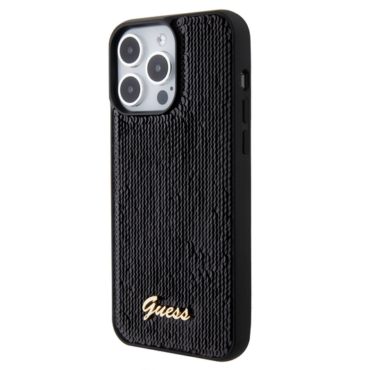 Case Guess Lentejuela con Logo Metálico para iPhone 15 Pro Negro - Elegancia y Protección