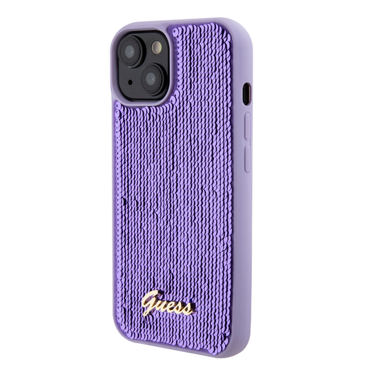 Case Guess Lentejuela Logo Clásico para iPhone 15 - Morado Glamuroso y Elegante