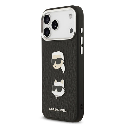 Funda Karl Lagerfeld de Piel Granulada Negra con Pins de Karl & Choupette para iPhone 17 Pro | Case Original de Lujo