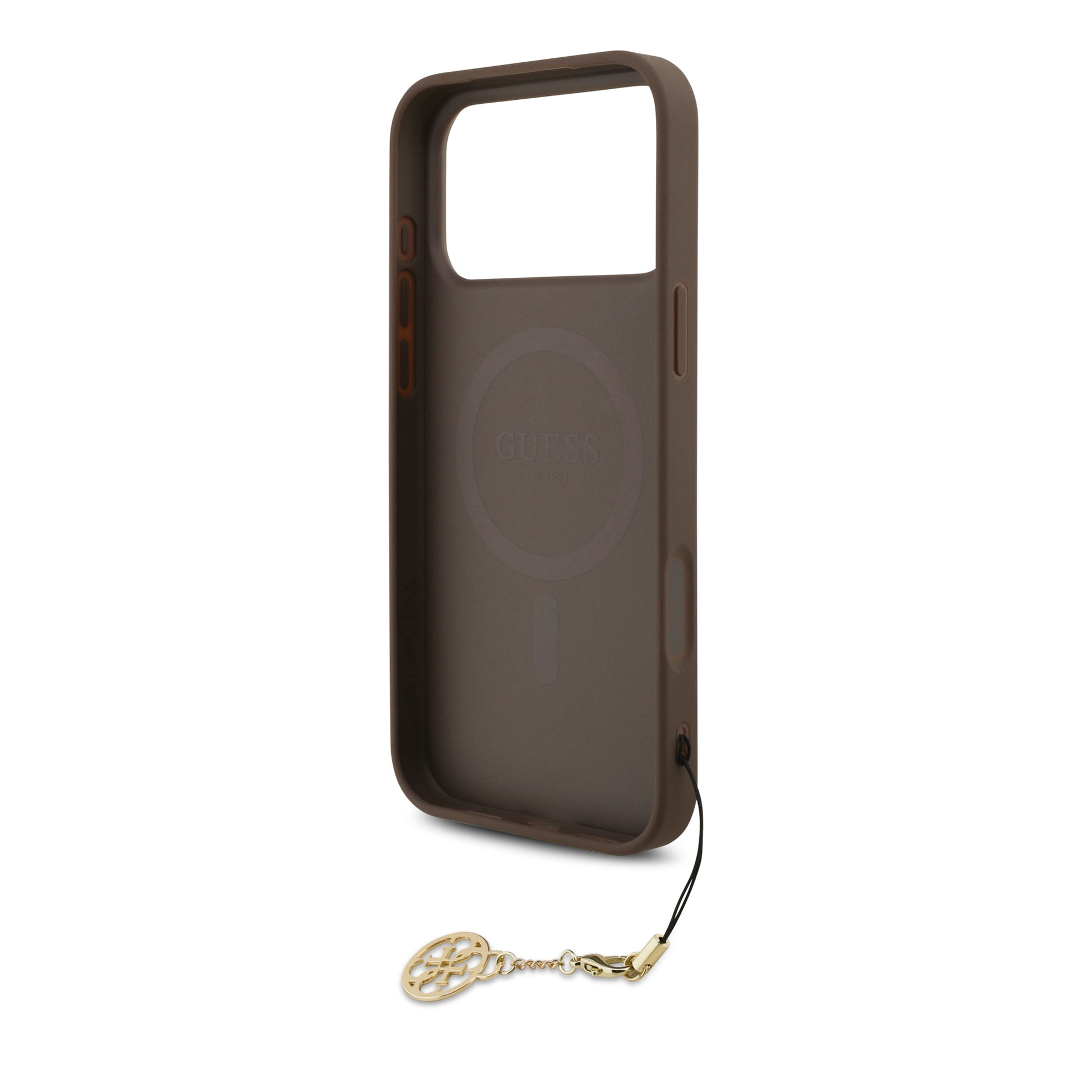 Destaca tu iPhone con la elegancia clásica de la Funda Guess Charm Edition 4G PU Leather Café para iPhone 17 Pro, un accesorio que combina lujo, moda y protección total.